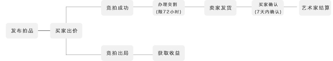 答:卖家发布拍品->买家拍得->买家交割->卖家发货->买家收货确认->卖家收到钱。